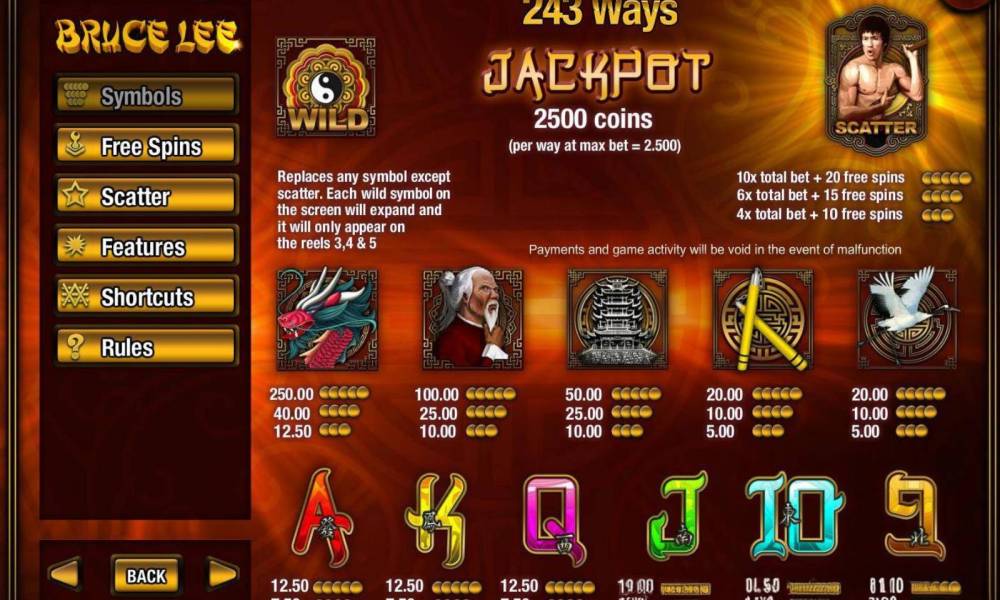Видеослот Bruce Lee предлагает игру на поле с 5 барабанами в 3 ряда. Выигрышные комбинации формируются произвольным образом, всего их насчитывается 243 варианта. Диапазон ставок – от 1 до 5 монет. Ставить можно от 1 до 10 центов, соответственно, максимальная ставка на спин составляет 12.5 евро. Выигрышными считаются комбинации, составленные из одинаковых символов, которые идут подряд начиная с 1 левого барабана. В игре применяется максимальный коэффициент х500. В игровом процессе принимают участие символы Wild, Scatter и другие, есть возможность получить большой приз.