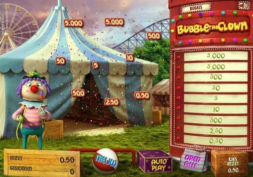 Клоунов любит большинство детей. Да и многие взрослые относятся к ним с симпатией. Поклонникам азартных игр, которым также нравятся клоуны, предлагаем сыграть в моментальную лотерею Bubble the Clown, разработанную и выпущенную компанией Sheriff Gaming. Это приятная почти во всех отношениях виртуальная скрэтч-карта, выполненная в трехмерной графике, в которой можно претендовать на крупную выплату в каждом раунде.