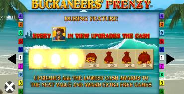 Buckaneers' Frenzy — это слот с 5 барабанами и 10 фиксированными линиями для выплат. Для формирования выигрышной комбинации необходимо собрать от 3 до 5 одинаковых знаков, начиная с крайнего левого барабана. Символы включают традиционные карточные номиналы (A, K, Q, J, 10) и тематические изображения, такие как бутылка рома, апельсин, попугай, якорь и мешки с добычей. Итого по 5 видов низко- и высокооплачиваемых знаков. Символ попугая является самым ценным и единственный из всех приносит выплату от 2 штук на линии. В игре также присутствуют специальные знаки, которые активируют бонусные функции и бесплатные вращения. Ставить на спин можно разные суммы от 0.1 до 10 евро. Пользователи могут получать крупные выигрыши вплоть до х50000 от ставки.