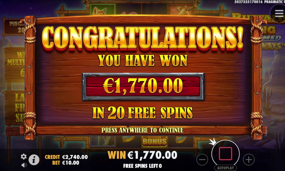 Диапазон ставок в Buffalo King Untamed Megaways варьируется от 0,20 до 240 у.е за вращение, что делает игру доступной для игроков с разными бюджетами.