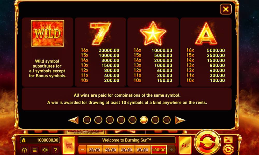 В слоте Burning Sun от Wazdan используется сетка 4x4 с системой Pay Anywhere, что означает, что для выигрыша достаточно собрать от 10 до 16 одинаковых символов в любом месте на экране. В игре нет фиксированных линий выплат, что делает процесс более гибким. Максимальная ставка в моменте игрового процесса достигает 10000 монет ,а минимальная, всего лишь 0.2 монеты. При том, что максимальный выигрыш достигает, аж 5000x раз больше от указанной ставки. Для активации бонусного раунда Hold the Jackpot нужно поймать 6 бонусных символов. Они фиксируются на барабанах до следующего вращения, если на экране их выпало 4 или 5. Также доступны специальные Sticky to Infinity символы, которые остаются на барабанах до конца бонусного раунда, раскрываясь в конце игры. Слот также предлагает возможность удвоить свой выигрыш через риск-игру, что добавляет элемент азарта.