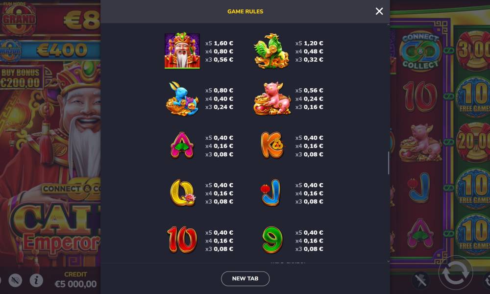Игровой автомат Cai Fu Emperor Ways Hall of Fame представила миру компания Atomic Slot Lab. Аппарат сделан в яркой цветовой гамме и уже это привлекает внимание. Когда человек открывает поле, он видит необычные барабаны, что еще больше заинтересовывает. Они не просто так отличаются, а имеют особые функции и участвуют в дополнительных раундах. Одним из них, приносящим хорошую прибыль, является Connect&Collect Feature Rules. Это известная фишка провайдера, способная за пару раундов «отбить» все вложенные в игру деньги. Онлайн слот богат и другими специальными возможностями, поэтому лучше попробовать его самостоятельно.