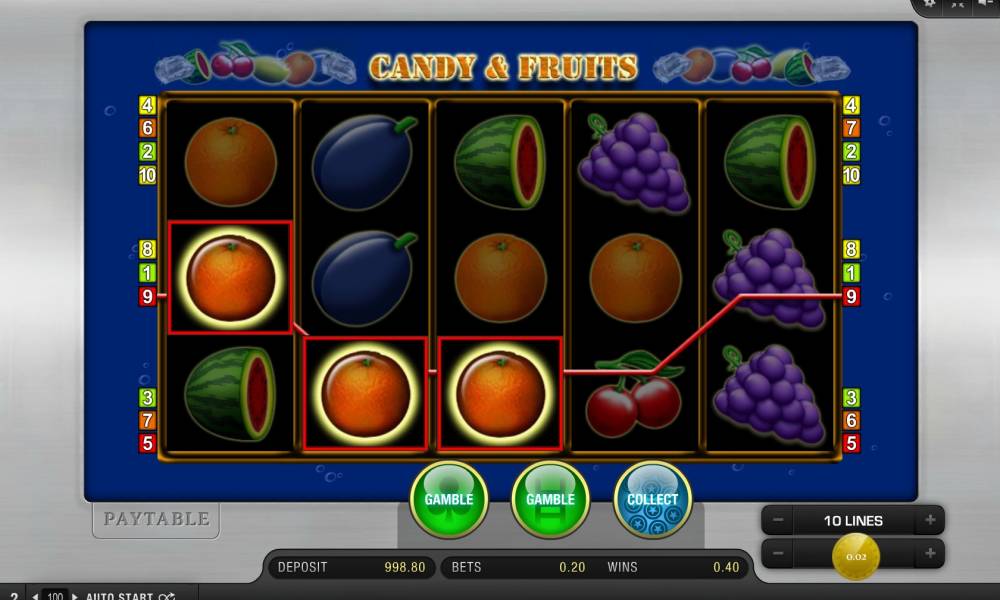 Candy & Fruits – видео-слот с пятью барабанами, десятью линиями и тремя рядами картинок на экране. Набор доступных функций весьма ограничен. Есть лишь базовые символы, особый элемент Wild и две разновидности рискованной игры по шансам. Пользователи могут играть на игровом автомате «Леденец и фрукты», активировав от одной до десяти линий. Ставка по каждой позиции может варьироваться от одного цента до двух евро. Таким образом, на спин нельзя поставить больше двадцати евро. Обычные картинки образуют выигрышные цепочки по стандартным принципам. Несколько одинаковых элементов должны оказаться на одной активной линии рядом друг с другом, начиная с первого барабана слева. Отдельно взятая последовательность дает выплату лишь по старшей комбинации. Но по результатам спина может сформироваться несколько выигрышных вариантов (на разных линиях). Сумма выплаты рассчитывается по классической формуле: ставка по линии умножается на коэффициент комбинации, указанный в специальной таблице (он может быть от х20 до х5000). Общий выигрыш за спин можно забрать сразу или поставить деньги (все или половину) на кон в раунде на удвоение. Он представлен в двух разновидностях, хорошо знакомых опытным любителям азартных развлечений подобного рода. Первый вариант представляет собой игру по шансам, в которой нужно угадывать цвет закрытой карты. Второй предусматривает движение по ступеням лестницы, и каждый шаг может быть выигрышным или проигрышным. В обеих версиях удачный исход на любом этапе удваивает текущую сумму, а неудачный означает ее проигрыш. В одном подходе можно играть несколько раз подряд, но имеется установленный лимит максимальной выплаты. Производитель утверждает, что модель возвращает 96% сделанных ставок на длинном игровом отрезке.