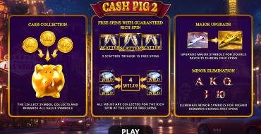 Слот Cash Pig 2 имеет достаточно простые правила, а все трудности для начинающих игроков происходят в режиме фриспинов. Поле с барабанами реализовано в виде стандартной сетки 5х4, где действует 30 фиксированных линий. Комбинации составляются слева направо, от 3 одинаковых символов подряд (либо через знак Wild). Ставка на раунд выбирается из диапазона от 0.3 до 54 евро. Символов используется 4 специальных и 9 рядовых. Максвин способен достигать значения в х8000 от ставки, что довольно неплохо. Бонусы могут быть активированы и в режиме стандартных вращений. За них отвечают монеты с коллектором и триггеры фриспинов.