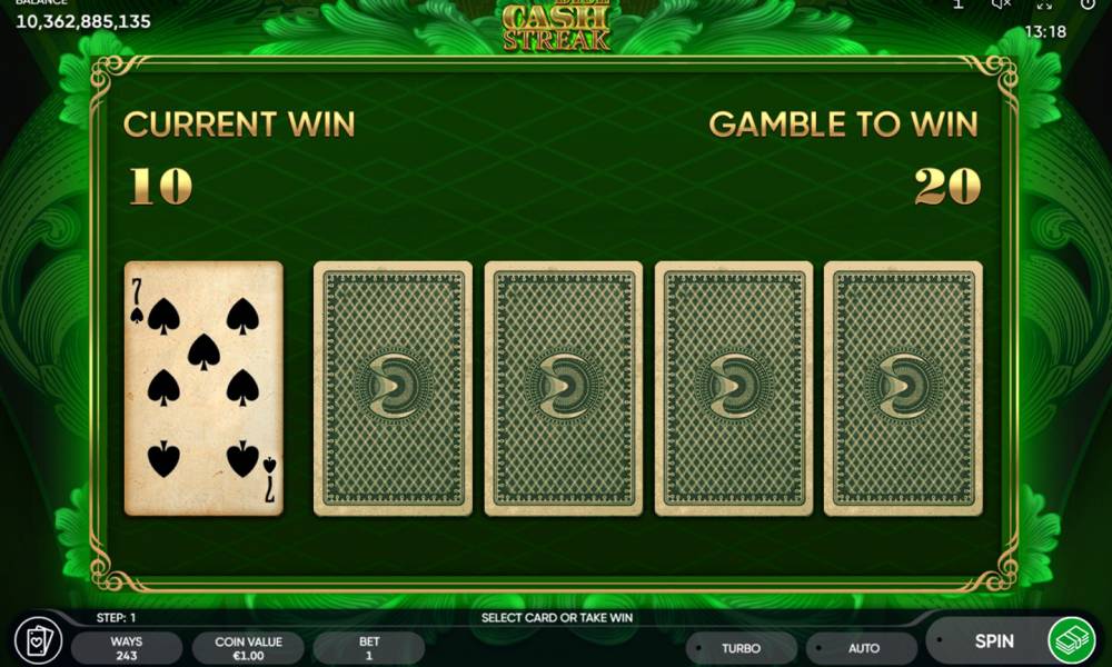 Традиционная игра на риск предлагает игрокам удвоить выигрыш вплоть до десяти раз. Выплата увеличится в 2 раза, если геймер откроет карту (1 из 4 предложенных), которая побьет карту дилера. В противном случае выигрыш аннулируется.