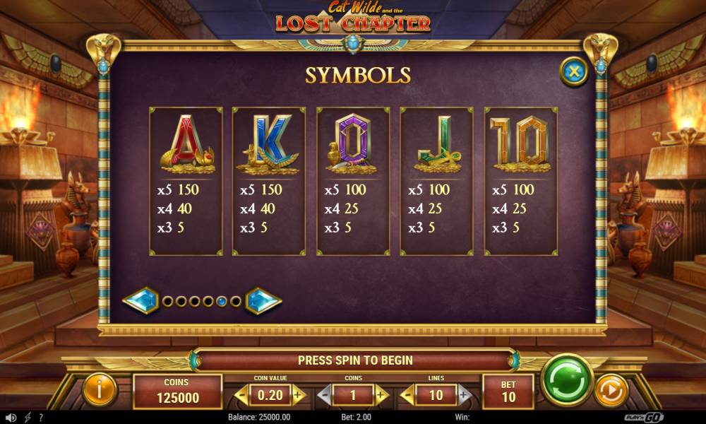 Игровой автомат Cat Wilde and the Lost Chapter от провайдера Play'n Go имеет стандартное игровое поле, состоящее из сетки 5х3. Выплаты производятся по 10 линиям.