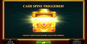 Cash Spins. Бонусная игра с респинами, запускается при появлении 3 символов Bonus в простых вращениях. На среднем барабане выпадает случайное количество знаков Collector от 1 до 3. Они остаются на поле до конца раунда. Далее запускается 3 респина. За них на остальных 4 барабанах могут появиться знаки Value. Если за 3 вращения выпадает хотя бы 1 такой знак — его множитель попадает в каждый символ Collector. Например, если на поле 2 Collector, и выпало 2 Value с множителями х2 и х5, то в обоих Collector накопится по х7, и итоговый выигрыш составит х14. Если за 3 респина появился хотя бы 1 знак Value — гемблер снова получает 3 попытки. Символы Value после появления исчезают. Если за 3 респина не выпало ни одного Value — раунд заканчивается, а множители, накопленные в знаках Collector — выплачиваются.