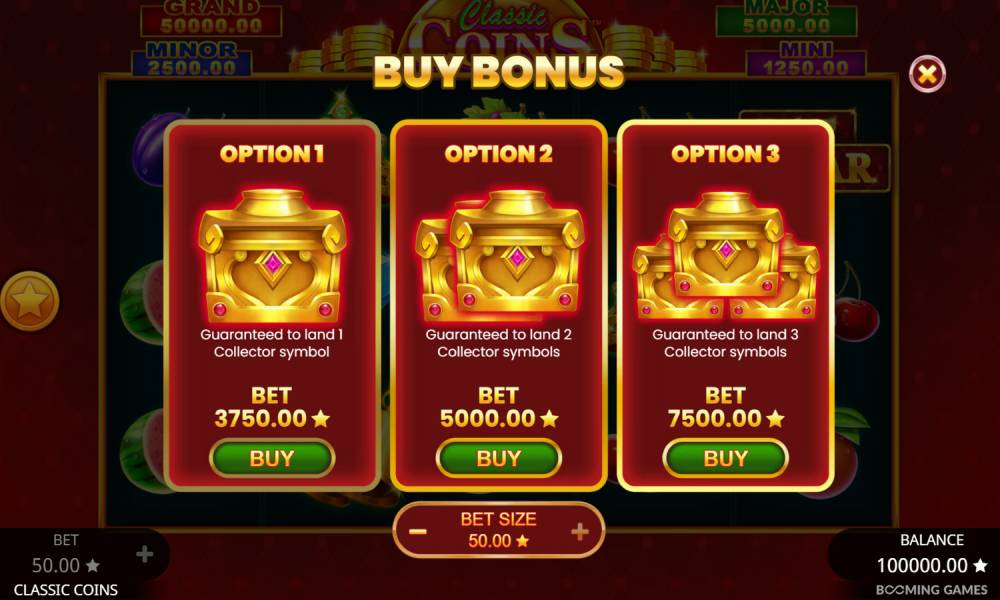 Buy Bonus. Это магазин с покупкой бонусной игры Cash Spins. Есть 3 варианта: с 1 символом Collector (цена запуска — х75 от ставки), с 2 символами (х100) и с 3 символами (х150).