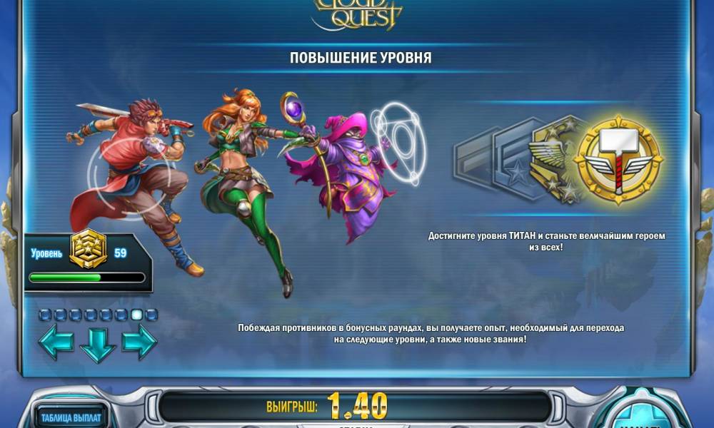 В Cloud Quest реализована система уровней. Победив определенное количество противников в бонусных раундах, вы переходите на следующий этап, где перед вами открываются новые возможности. Детали уточняйте в правилах.