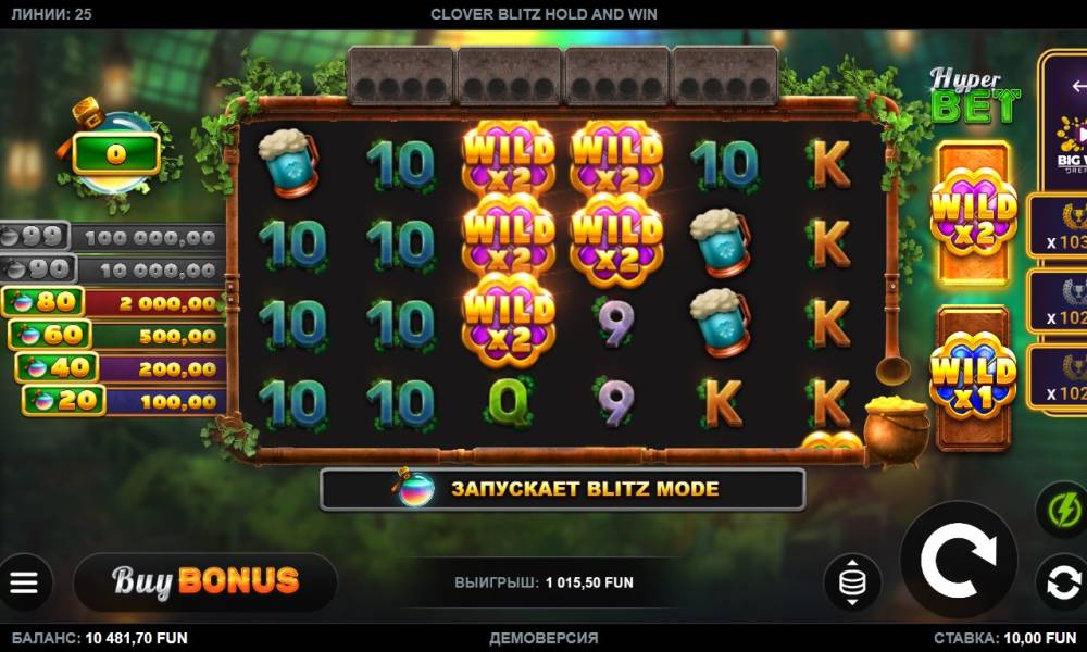 В Clover Blitz Hold and Win от Kalamba Games 6 барабанов с 4 ячейками на каждом. Учет комбинаций проходит по 25 линиям, слева направо, все выигрыши суммируются. Диапазон ставок составляет от 0.2 до 80 у.е. Финальное значение достигается при HyperBet x2.