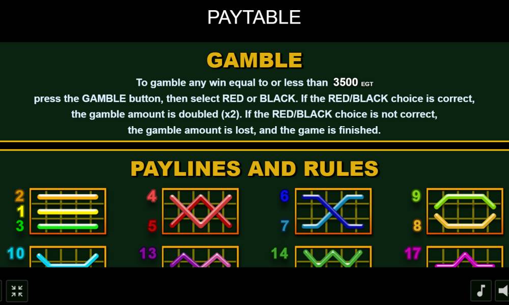 Gamble. После каждого удачного спина игрок может поставить полученную сумму на кон в риск-игре. Если он угадает, красная или черная карта выпадет на поле, то получит удвоение выигрыша. Ошибется — потеряет деньги. После победы пользователь может забрать приз или вновь рискнуть им и получить возможность удвоить сумму.
