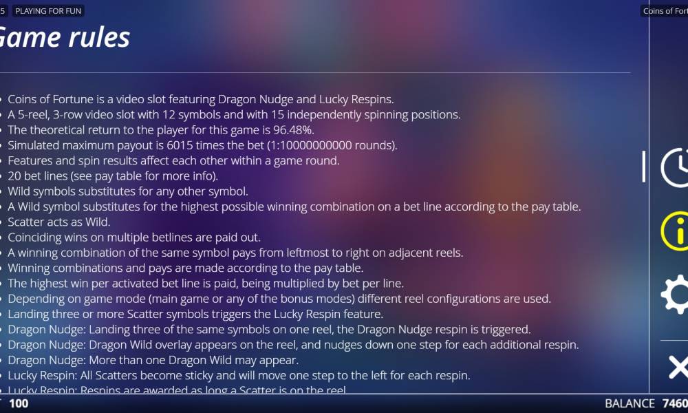 Испытать Coins of Fortune можно в любом интернет-казино, работающих с софтом Nolimit City или же непосредственно на этой странице.