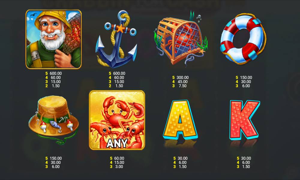 Символ Wild — это рыбак, который бывает обычным или золотым. Знак выпадает на всех барабанах и приносит самостоятельную выплату от 2 штук на линии. Составляет призовые комбинации с другими символами. Участвует в бонусной функции, собирая ракообразных. Золотой рыбак дополнительно дает множитель — х2, х3, х4, х5 или х10.