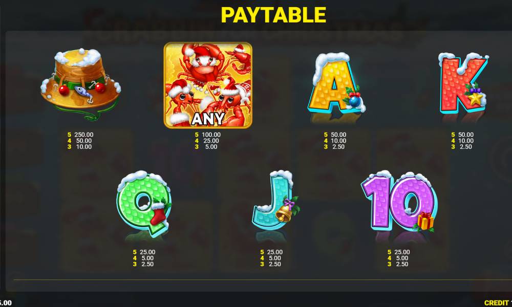 В онлайн-слоте Crabbin' For Christmas 5 барабанов по три ряда. Все выигрыши оплачиваются слева направо на 10 фиксированных линиях. Призовые цепочки состоят из 2-5 одинаковых символов. Пять младших знаков и три средних дают награду от 3 штук, а два старших — от 2. Диапазон ставок на спин небольшой — 0.1-20 евро, но механика автомата позволяет выигрывать много наград. Максимальный приз составляет х50000 от поставленный суммы. В слоте есть два дополнительных раунда, покупной бонус, множители и джекпоты.