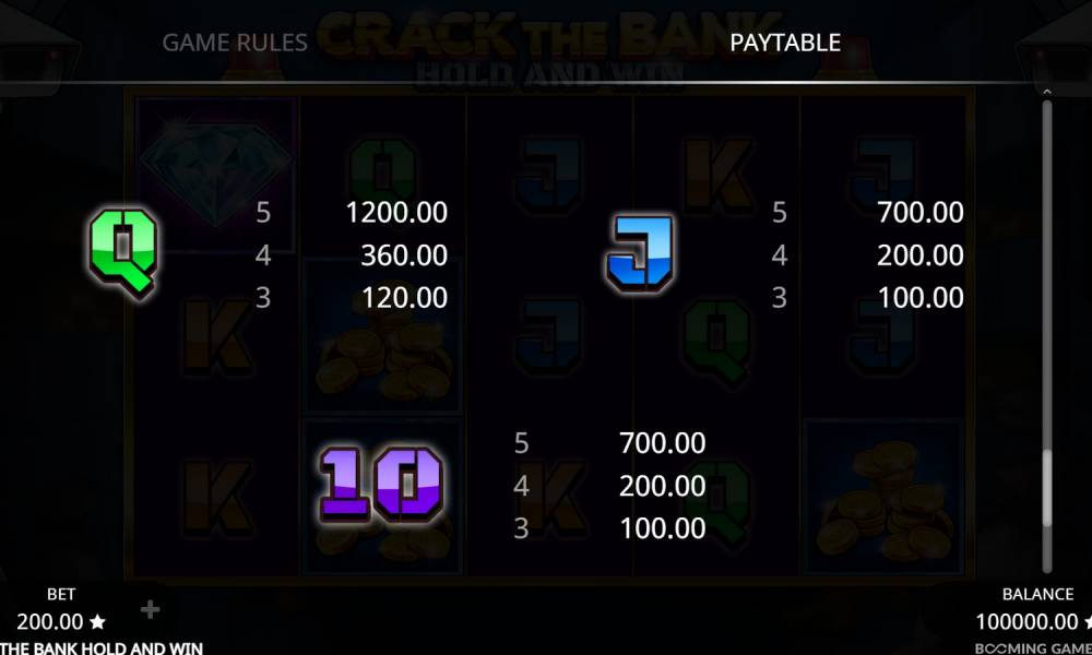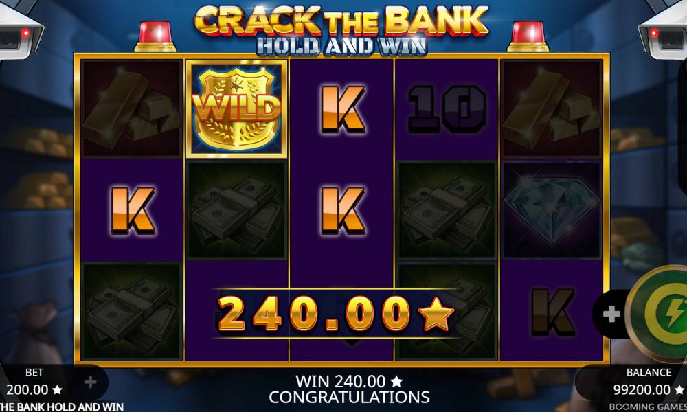 Во второй половине 2022 года Booming Games добавили в свое портфолио Crack the Bank Hold and Win. Тематика слота — ограбление банка. Максимальный множитель, несмотря на громкое название, не очень большой: х2000. Игра проходит на небольшом поле 5х3. Есть фриспины с липкими Wild (сохраняются до конца раунда) и раунд с 3 респинами и гарантированной выплатой.