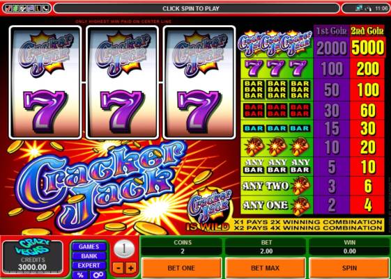 Cracker Jack – это трехбарабанный игровой автомат с непрогрессивным джекпотом и одной линией выплат. Это классический игровой автомат от компании Microgaming, в котором имеется максимальный джекпот размером 25 тысяч долларов.