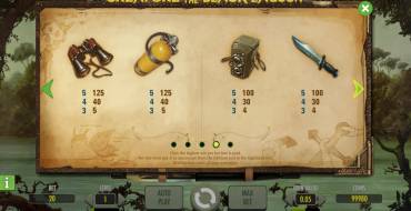 На барабанах видео-слота Creature from the Black Lagoon изображены главные герои фильма, которому посвящен игровой автомат онлайн. Вы увидите Кей, Дэвида, Карла и Лукаса. Также используются картинки с различными элементами экипировки (бинокль, нож, акваланг и так далее).