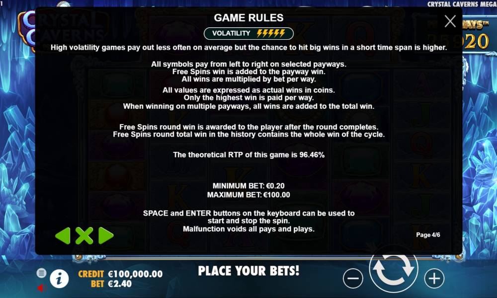 Игровой автомат Crystal Cavern Megaways от провайдера Pragmatic Play имеет классическое игровое поле из 6 барабанов с динамичным числом символов. Выплаты производятся по комбинациям, чье число может достигать 117649 штук.