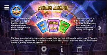 Джекпоты: Есть три фиксированных джекпота: Cygnus, Star и Sky. Чем выше ваша ставка, тем выше ваш шанс выиграть один из трех джекпотов в Колесе Лебедя.