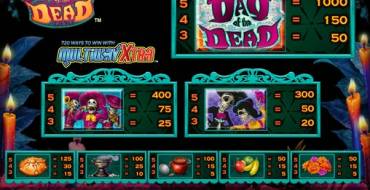 Выигрышные комбинации образуются из по принципу, который создатели видео-слота Day of the Dead назвали MultiWay Xtra (он используется также в других моделях от IGT). Выплаты начисляются за три и более одинаковых картинки, расположенных рядом на соседних барабанах начиная с первого или с пятого в обратном направлении. Всего в Day of the Dead предусмотрено 720 вариантов комбинаций.