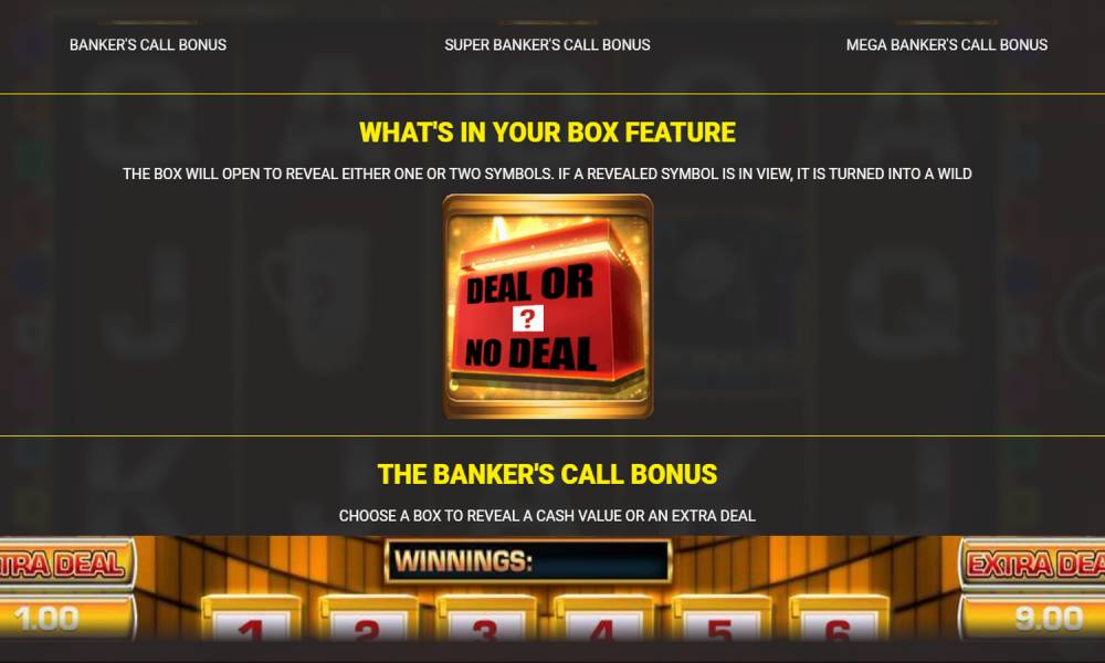 The Banker's Call Bonus. Активируется при выпадении трех символов Scatter. Перед пользователем открывается новое поле с 24 коробками. Он должен выбирать любые и решать, заключить сделку или нет. Когда игрок нажмет Deal, он получит все накопленные призы. Но если он не успеет этого сделать и позвонит банкир, то весь прогресс будет потерян.
