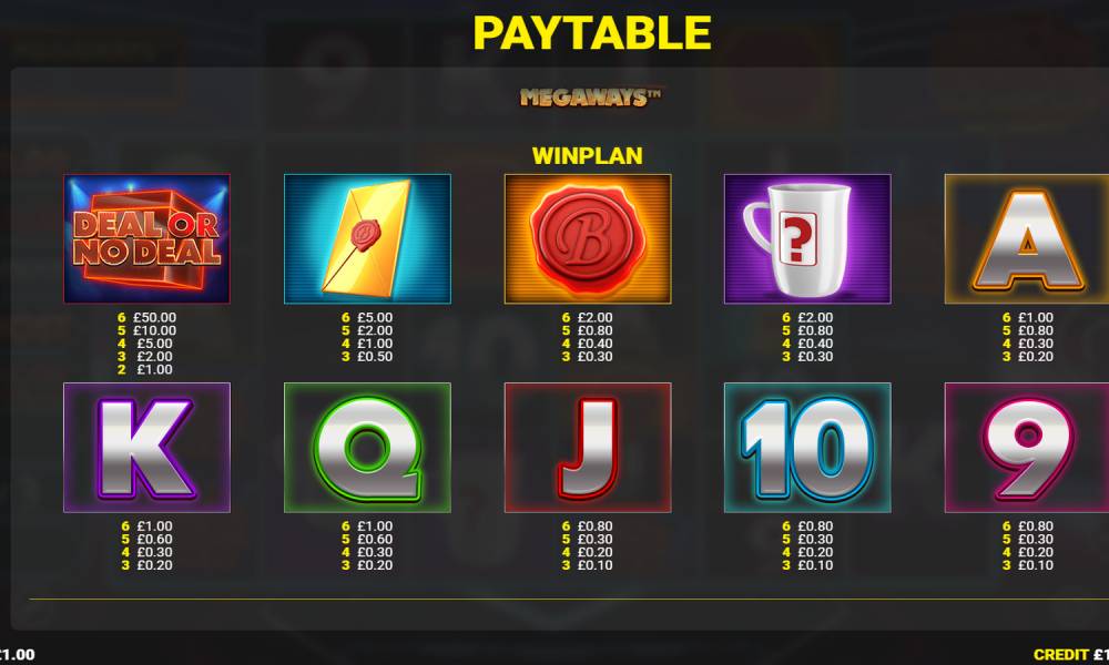 В игровом автомате Deal or no Deal: The Big Hit Megaways — Jackpot King 6 вертикальных барабанов и один горизонтальный, который размещается над 2-5 столбцами. Количество ячеек на катушках не фиксированное. Чем их больше, тем выше вероятность получить приз сразу по нескольким способам. Максимально может быть 117649 линий для выплат. В игре участвуют 6 младших и 4 старших вида символов. Все, кроме одного, составляют комбинации из 3-6 знаков. Только Deal or no Deal дает выплату от 2 штук на линии. Все цепочки составляются от левого края к правому. Пользователей жду бонусные раунды и фриспины, а также множители и джекпоты. Максимальный выигрыш в слоте составляет х50000 от ставки, которую можно делать от 0.1-10 евро.