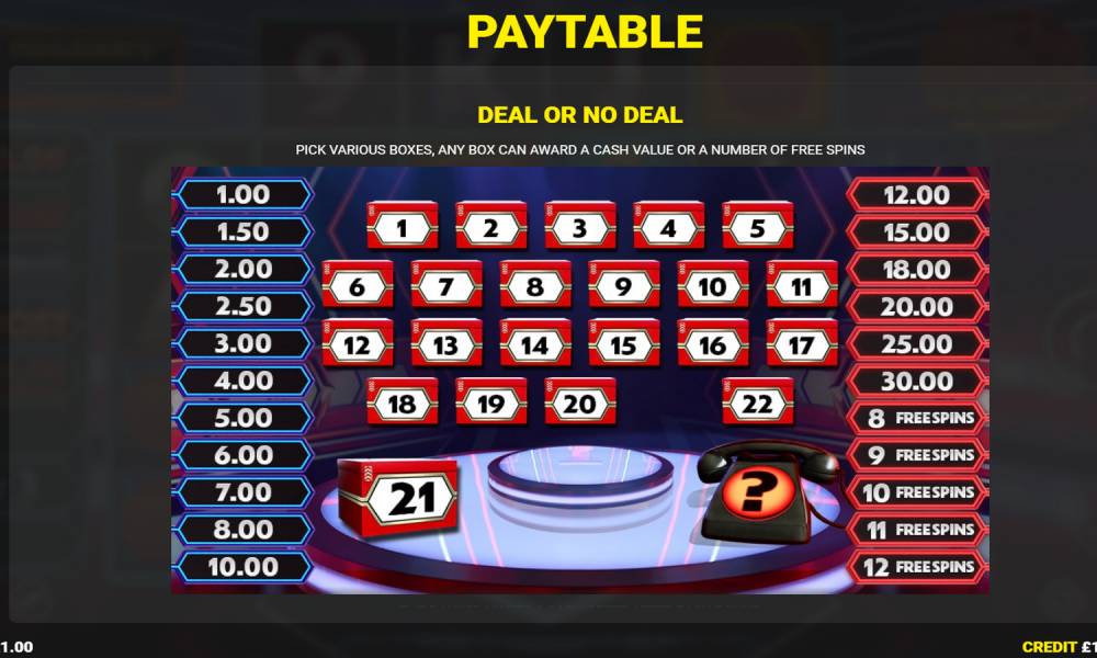Deal or no Deal. Это специальный раунд, где пользователю предстоит выбирать коробки. В них спрятаны определенные призы. Игра идет до тех пор, пока не зазвонит телефон и ведущий не закончит раунд. По итогу пользователь получает накопленные денежные значения и/или фриспины.