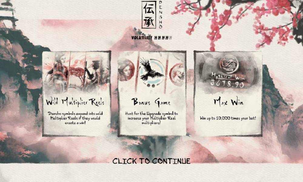 Действие в слоте Densho происходит на пяти барабанах с четырьмя рядами символов и десятью линиями выплат. Игрокам предоставлена возможность ставить от 10 у.е до 100 у.е за спин.