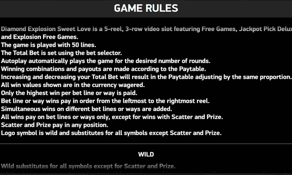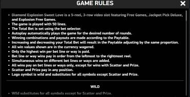 У слота приятно оформлен дизайн: он минималистичный и простой, но аккуратный и современный. Почти весь интерфейс собран в отдельный блок под полем. Единственный элемент, который туда не попал — размеры джекпотов: они отображаются над полем. В основном блоке слева направо находятся: раздел с информацией (i), кнопки - и + для изменения ставки, большое окно Win (здесь появляются размеры выигрышей), кнопка Turbo (для ускорения/замедления барабанов), кнопка Auto (для настройки и запуска автовращений) и ручное вращение. В нижнем левом углу, на черной подложке, отображается баланс, а рядом с ним есть еще 2 кнопки — включение-выключение звука и еще 1 ссылка на раздел с правилами. Вот советы для гемблеров, которые хотят поиграть в Diamond Explosion Sweet Love: