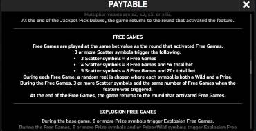Explosion Free Games. Аналог фриспинов. Запускается при появлении 6+ символов Prize в простых вращениях или 6+ символов Prize + Wild во фриспинах. В раунде есть 5 вращений. Все символы Prize/Prize + Wild (в том числе те, которые активировали раунд) прилипают к своим ячейкам до конца раунда. Только эти символы участвуют в игре. Есть шанс, что за 1 вращение на поле появится новый знак и заполнит пустую ячейку. В конце раунда награда выплачивается за группы символов, стоящие рядом. За 1 отдельный знак дается выплата х1, за целое заполненное поле — случайная награда от х100 до х225, или джекпоты Major или Grand.