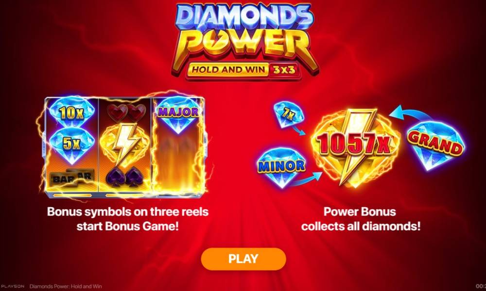 Игра в Diamonds Power: Hold and Win проводится на классическом поле из 3 барабанов с 3 ячейками на каждом. Используется 7 рядовых и три специальных символа, 2 из которых отвечают за бонусы. Всего активно 5 фиксированных линий, между которыми распределяется ставка. Диапазон значений последней от 0.1 до 100 у.е. Фриспины не реализованы. Самый крупный выигрыш приносит джекпот, размер которого рассчитывается согласно таблице выплат: ставка игрока*1000 раз.