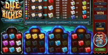 Цель игры в Dice of Riches – набрать как можно больше очков, чтобы получить выплату. Баллы зачисляются за три одинаковых кубика, расположенных по горизонтали или по диагонали в любом из четырех окошек.