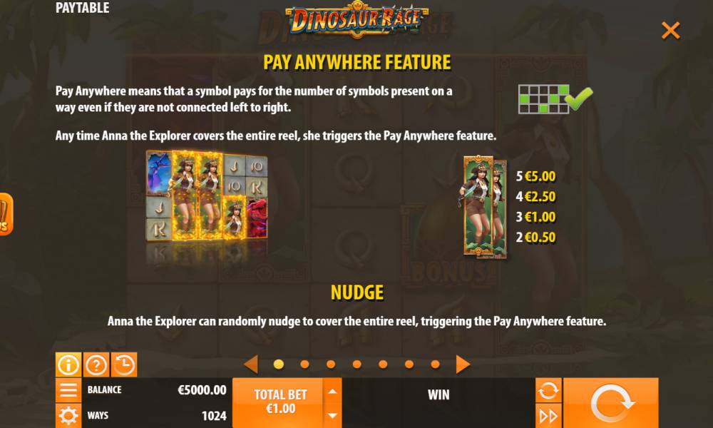 В онлайн-слоте Dinosaur Rage насчитывается 5 барабанов в 4 ряда и 1024 линии выигрышей, которые оплачиваются при расположении одинаковых символов подряд слева направо либо в результате действия функции Pay Anywhere, когда местонахождение символов на линии не имеет значения. Чтобы Pay Anywhere Feature активировалась, необходимо, чтобы символ Исследователь Анна покрывал весь барабан (занимал все 4 ячейки). Если изображений Анны на поле меньше 4-х, может рандомно включиться функция Nudge, чтобы девушка-ученый все-таки заняла весь барабан и запустила Pay Anywhere. Кроме того, выпадение 3 и более одинаковых символов (для Исследователя Анны – 2 и более) позволяет применить множитель к ставке. Значения множителей приведены в таблице выплат. Максимальное умножение х5 к ставке дает появление 5 символов с очаровательной Исследовательницей. Диапазон ставок – от 0.2 до 100 евро.