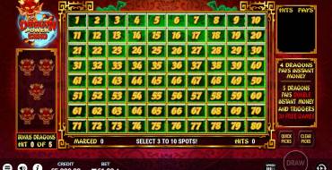 Автомат Dragon Power Keno не имеет барабанов, здесь просто поле 10х8, состоящее из 80 ячеек. Суть игры в том, чтобы делать ставку на несколько чисел и смотреть, сыграла ли она. Можно поставить от 3 до 10 вариантов, а после запустить игру. Слот покажет 20 рандомных чисел. Выплата проводится по-разному, в зависимости от того, сколько ставок было сделано и сколько из них сыграло. Например, при выборе десяти чисел таблица такая: