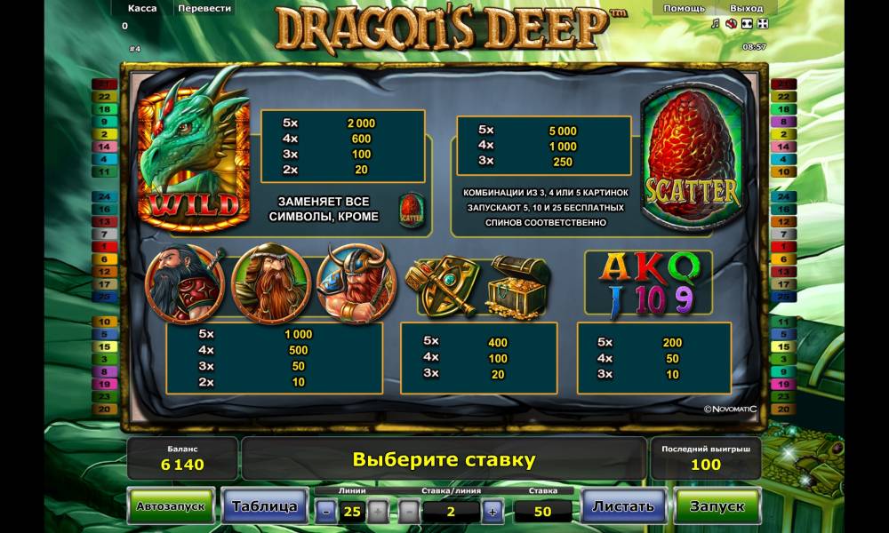 Dragon’s Deep имеет пять барабанов, двадцать пять линий и пятнадцать картинок на основном экране. Задействовать можно любое количество предлагаемых полос. Ставки по ним всегда равны: от двух до четырехсот кредитов в каждом случае. Выходит, что вы сможете играть по общей ставке не менее двух единиц и не более десяти тысяч монет. В слот-машине предлагаются базовые картинки, символы с расширенными функциями, бесплатные спины с особыми опциями, риск-игра на удвоение и так далее. Простые элементы становятся выигрышными, когда формируют на активной линии непрерывную последовательность нескольких одинаковых изображений. Они обязательно должны простираться от первой колонки слева направо. Лишь самая длинная цепочка по каждой позиции дает выплату. Ее размер определяется по двум величинам: ставке, которую вы сделали на линию, и коэффициенту данной комбинации, который может быть от х5 до х1000. Расчет производится перемножением параметров. Если вариантов по разным полосам несколько, выигрыши суммируются. По завершению спина, принесшего вам выплату, можно запустить раунд на удвоение. Здесь вам предстоит угадывать цвет закрытой карты. Правильный выбор увеличивает сумму в два раза. Ошибка приводит к проигрышу ставки. Если вы особенно азартны, можете действовать несколько раз кряду, пока не достигнете лимита, зависящего от ставки. Все исключения обсуждаются ниже, как и дополнительные функции. Данных о теоретическом возврате у нас нет.
