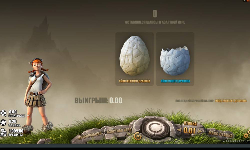Как и все модели от компании Rabcat, «Миф о драконах» обладает необычным дизайном. Основную часть экрана занимают барабаны. Слева находится главная героиня игры, принимающая непосредственное участие в битве с драконами и реагирующая на все происходящее забавными движениями. Под барабанами располагается панель управления с интуитивно понятными кнопками. Они подписаны на русском языке, что облегчает знакомство с интерфейсом. Данные по игре появляются слева на экране. В правом нижнем углу есть две шестеренки. Они открывают диалоговое окно параметров, в котором можно настроить звук, скорость геймплея и так далее. В таблице вы найдете все необходимые данные о модели, включая коэффициенты выплат и общие правила. Вам не придется скачивать игровой автомат, ведь он запускается в браузере.