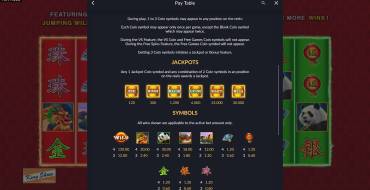 Джекпоты можно получить в обычном раунде и в бесплатном. Для этого нужно собрать одну монету с наименованием джекпота и две пустых. Приз будет сразу выплачен игроку. Всего в онлайн-слоте Dragons vs Pandas шесть видов джекпотов: