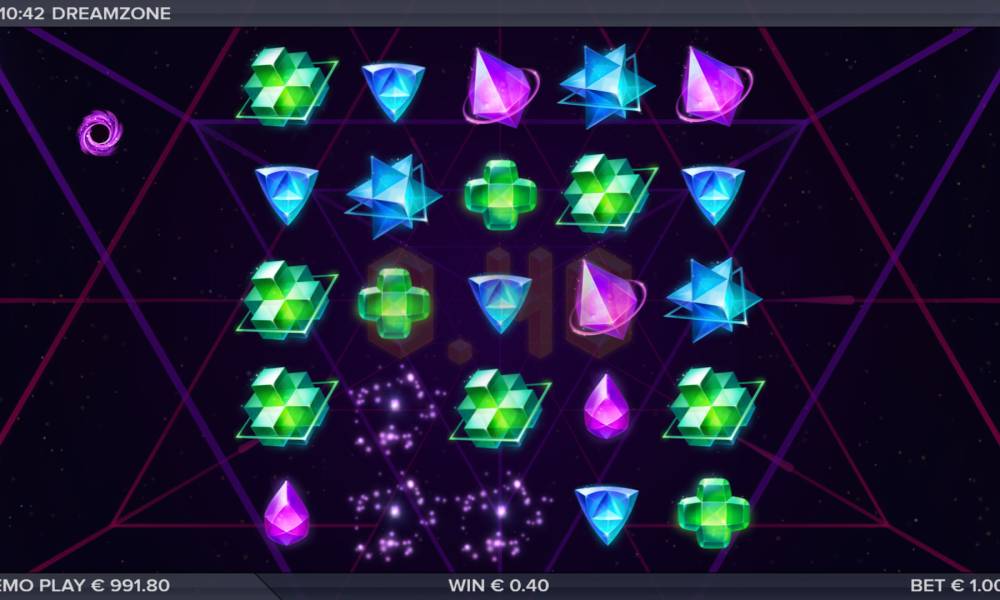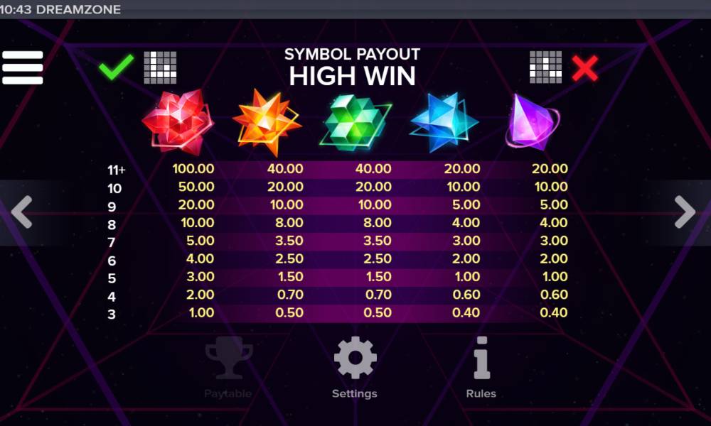 На поле слота Dreamzone располагаются двадцать пять картинок, выстраивающихся по схеме 5х5. Активные линии отсутствуют. Выигрышные комбинации формируются по принципу кластеров.