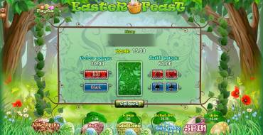 Easter Feast – это 5-барабанный видео-слот, на экране которого располагаются в три ряда обычные и особые символы. Базовые картинки формируют оплачиваемые комбинации по общим правилам. Специальные элементы действуют несколько иначе. Также в модели есть два тематических бонусных раунда, бесплатные вращения и риск-игра по шансам. Играть клиенты могут по одной – двадцати активным полосам. Разрешается на каждую из них ставить от одного цента до двух кредитов (имеются в виду денежные единицы, которые выбрал пользователь). Соответственно, на спин принимается до сорока кредитов. Выигрышными комбинациями считаются непрерывно расположенные на активных линиях цепочки, составленные из одинаковых картинок. Они обязательно должны начинаться с первого барабана слева, и только самая длинная из них на отдельной взятой полосе принимается в расчет. При этом на разных позициях в одном спине может быть несколько оплачиваемых вариантов. Суммы выигрышей рассчитываются умножением ставки по линии на коэффициент комбинации, который здесь варьируется от х2 до х500. Если цепочек несколько, выплаты по ним складываются. Все деньги, которые были начислены клиенту по результатам вращения барабанов, можно сразу забирать или ставить на кон в игре по шансам. Этот раунд выдержан в классическом стиле. Игрок решает, что он будет угадывать: цвет или масть карты. Правильный ответ в первом случае удваивает сумму, во втором – увеличивает ее в четыре раза. Можно в одном подходе играть до пяти раз подряд. Ошибаться нельзя. Как утверждается в официальных правилах, игра на длинном отрезке возвращает 92,72% общей суммы ставок пользователей.