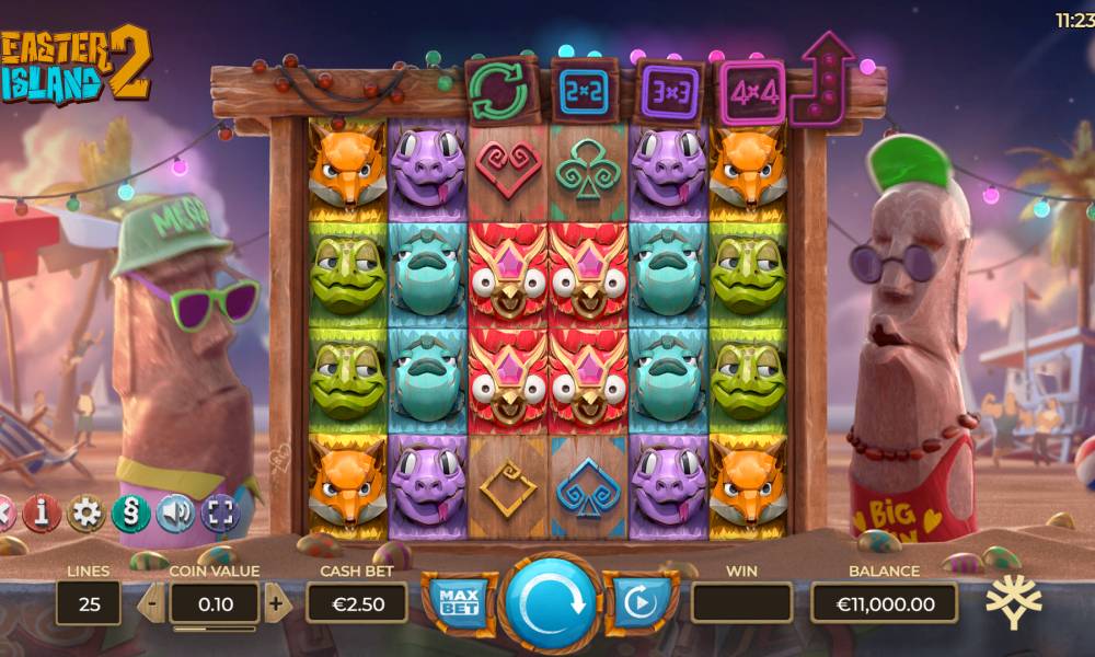 Слот Easter Island 2 от провайдера Yggdrasil имеет классическое игровое поле, которое состоит из 5 барабанов по 3 символа. Все выплаты осуществляются по 25 игровым линиям, которые могут увеличиваться по ходу игры.