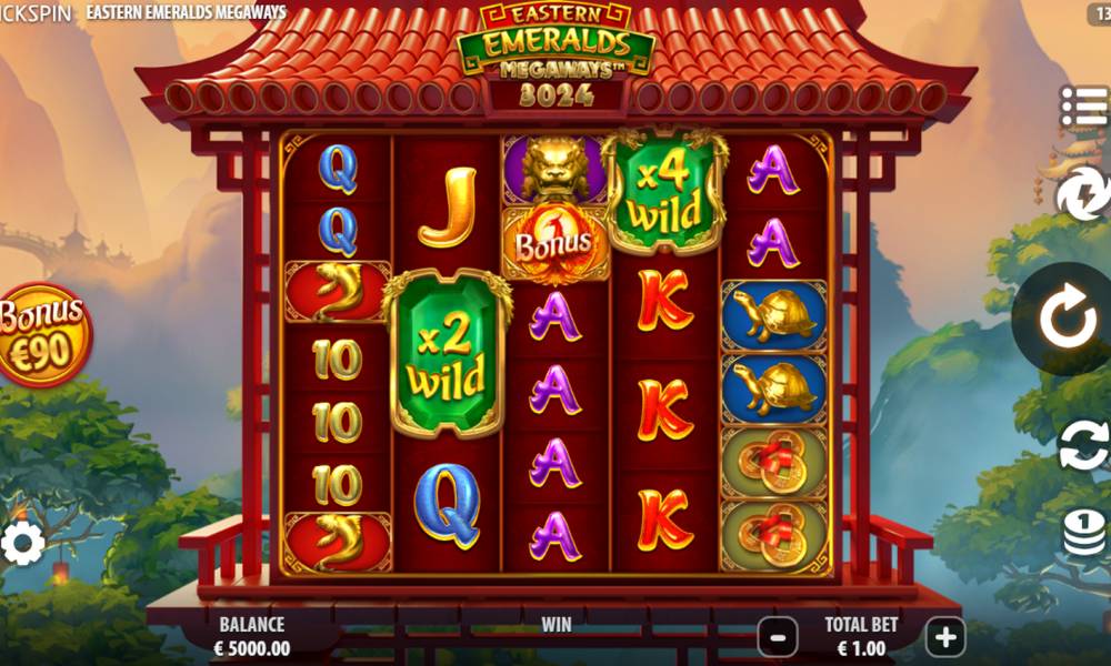 Играйте в слот Eastern Emeralds MEGAWAYS просто и с удовольствием! Барабаны расположены внутри традиционной азиатской пагоды, справа находятся панель управления и справочная информация, слева – кнопка для покупки бонуса. До начала игры следует: