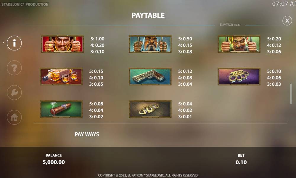 Игровой автомат El Patron от провайдера Stakelogic имеет стандартное игровое поле, состоящее из 5 барабанов по 5 символа в каждом. Выплаты осуществляются по 25 фиксированным линиям.