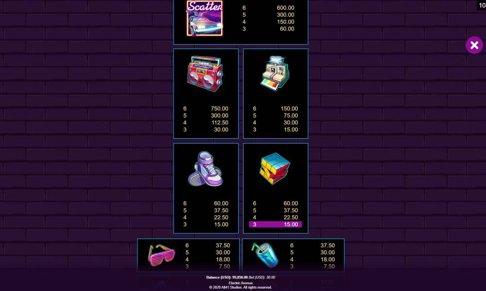 Читайте далее в обзоре видеослота Electric Avenue All41Studios на Casinoz о бонусах, исключениях из правил и особых символах.