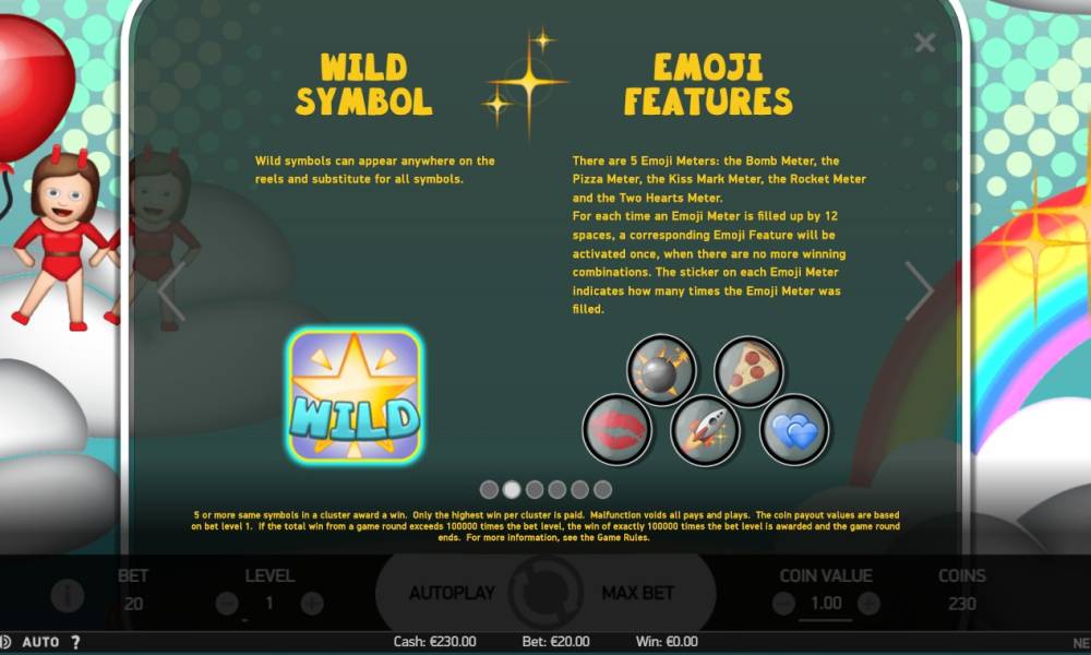 Скорее всего, вам уже встречались азартные онлайн-игры с подобной системой начисления выплат. Но модель Emoji Planet отличается разнообразием бонусных возможностей, которые делают ее вдвойне интересной и придают ей «изюминку». Нескучная тематика, удобный дизайн, разнообразные настройки и другие особенности делают слот еще более привлекательным для пользователей.