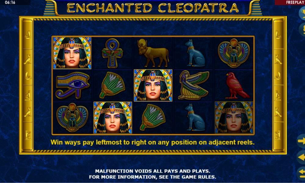Игровое поле слота Enchanted Cleopatra от провайдера Amatic Industies представлено сеткой 5х3 с 243 активными игровыми линиями.