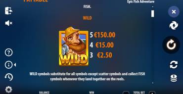 Онлайн-слот Epic Fish Adventure располагает 5 барабанами в 3 ряда с 10 фиксированными линиями выплат. Диапазон ставок – от 0.1 до 100 евро. Выигрышные сочетания образуются из одинаковых символов, которые должны располагаться подряд слева направо. Появление на барабанах 3 и более одинаковых символов дает возможность применить множитель с установленной ставке. Размеры множителей указаны в таблице выплат.
