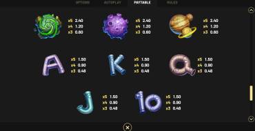 Игровое поле онлайн-слота Expansion! имеет формат 5х4. Все символы связаны с космосом — планеты, звезды, космические корабли. В игре принимают участие по 5 видов младших и старших знаков. Все они оплачиваются за 3-5 штук на линии. Одинаковые знаки должны составлять цепочку слева направо с первого барабана. Линий для выплат фиксировано 30. Максимальный приз в слоте составляет х1212 от действующей ставки. Пользователь может ставить на спин от 0.15 до 300 евро. В игре есть покупной бонус, фриспины и специальные знаки.