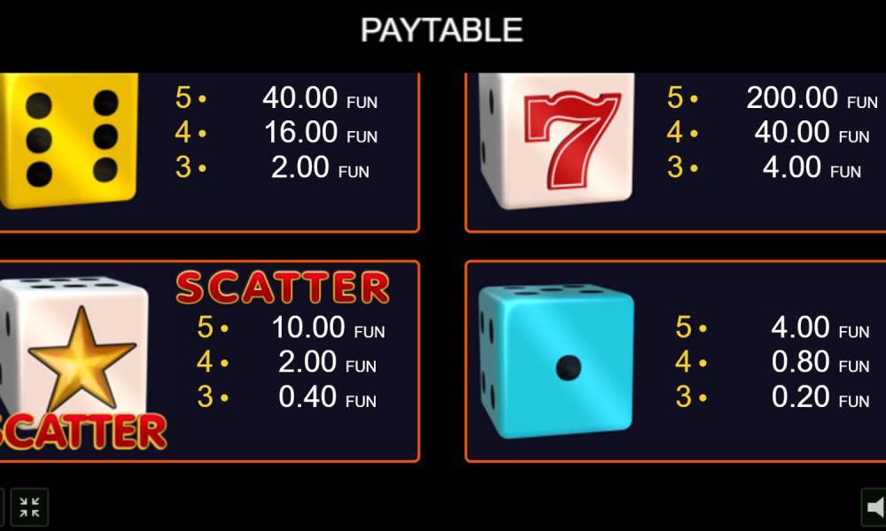 Extreme Dice — это пятибарабанный слот с 15 ячейками. Все символы — это игральные кости. Они разделены на низко- и высокооплачиваемые и в каждой группе по 4 знака. Розовый кубик дает награду от 2 штук, все остальные от 3. Засчитываются цепочки, составленные с крайнего левого барабана подряд. Для выплат предусмотрено всего лишь 5 фиксированных линий. Зато в автомате широкий диапазон ставок — от 0.01 до 1000 евро. Пользователи могут рассчитывать на максимальный приз х5000, но им не ограничены прогрессивные джекпоты. Также провайдер добавил две бонусные функции, которые делают игру интереснее.