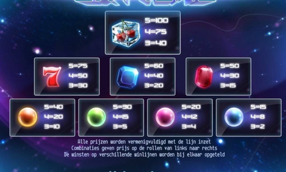 Определить тематику нового 3D видео-слота от компании Stake Logic довольно сложно. Это красочная модель под названием Extreme («Экстрим»), в которой на фоне космического пейзажа вращаются барабаны с драгоценными камнями, разноцветными жемчужинами, кубиками льда, в которых заморожены различные предметы, и прочими ничего не значащими символами. При этом бесплатный игровой автомат обладает некоторыми весьма интересными и привлекательными для пользователей функциями, так что не стоит обделять его вниманием.