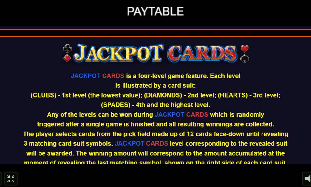 Чтобы выиграть один из прогрессивных джекпотов, необходимо обладать хорошей удачей. Раунд Jackpot Cards запускается в случайный момент. Пользователь должен открывать представленные 12 карт до тех пор, пока не найдет три одинаковых. Их масть будет соответствовать джекпоту. После получения он сбросится до своего начального размера, а потом будет постепенно расти.